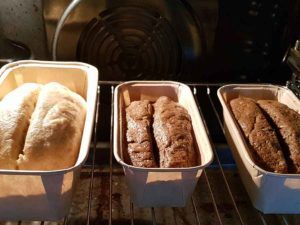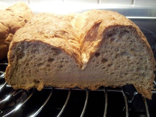 Unsere Brote haben auch im fertig gebackenen Zustand noch einen sehr hohen Wassergehalt, so dass eine deutliche Verlängerung der Backzeit gar kein Problem ist. Durch längeres Backen werden sowohl Kruste als auch Krume trockener.