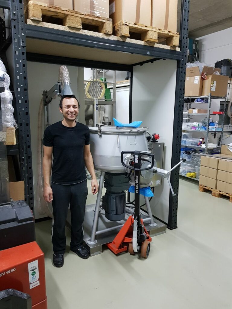 Seit über einem Jahr, schon vor dem ersten Spatenstich, hatten wir mit der Anlagenplanung begonnen. Hauptakteure waren die Firma AZO, die sämtliche Komponenten zum Rohstoff- und Pulverhandling lieferten, sowie die Firma AMIXON, aus deren Fertigung unser “Herzstück”, der Lebensmittelmischer stammen sollte.