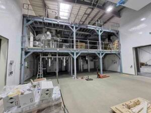 Nachdem die Stahlbühnen aufgebaut waren, begannen die AZO Monteure mit der Installation der Einzelkomponenten: Sackaufgabe- und Siebestationen, BigBag-Befüll- und Entleerstation, Entstaubung für das gesamte Gebäude und die Anbindung an unsere Verpackungsmaschine (das war eine der wenigen Anlagen, die wir aus Bobenheim mitbrachten – alles andere war neu geplant worden).
