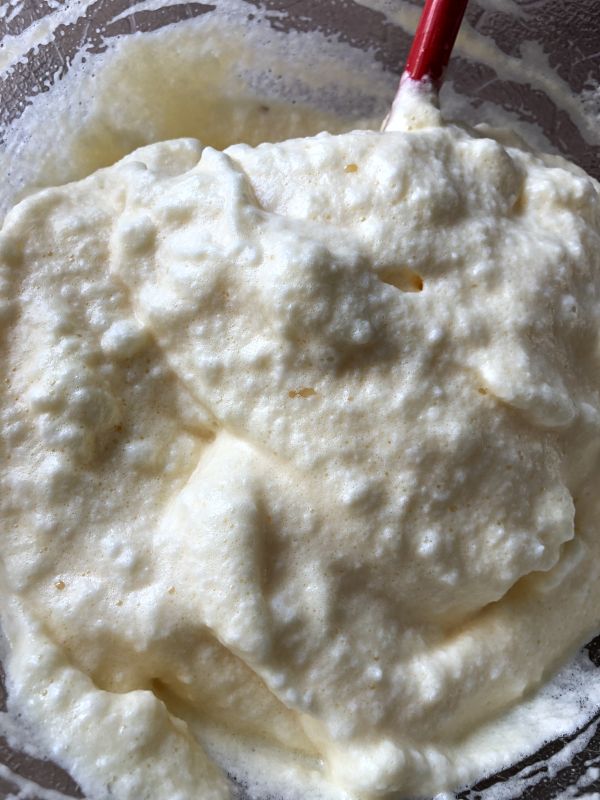 - Die Eigelbmasse auf den Eischnee geben und vorsichtig unterziehen!