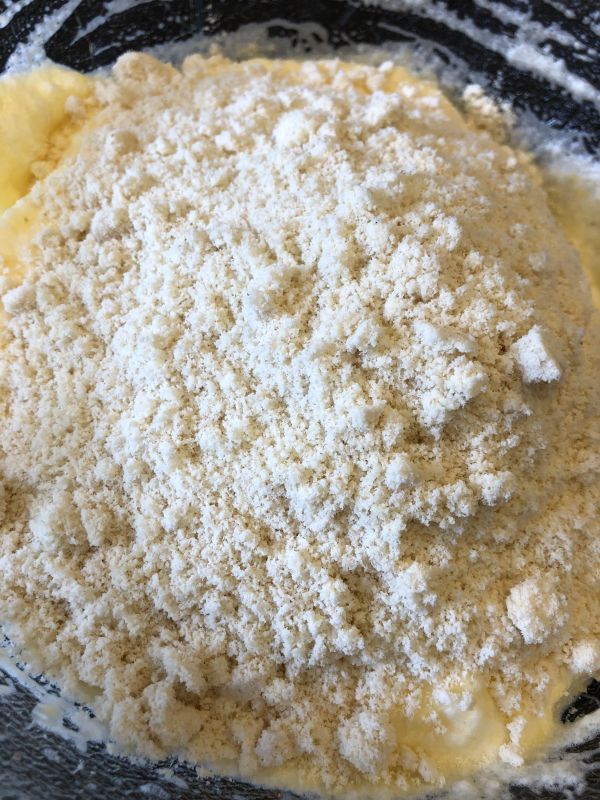 - Mandelstaub und Backpulver vermengen, auf die Eigelb-Eischneemasse geben und sachte mit einem Rührlöffel unterziehen.