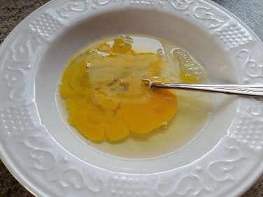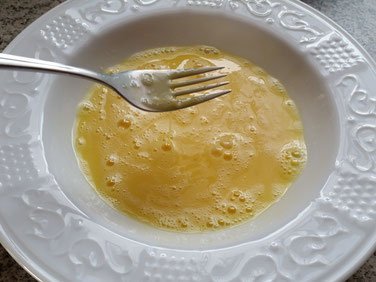Dieses mit 1/2 TL Salz und Gewürzen deiner Wahl mischen und in einen Suppenteller geben.