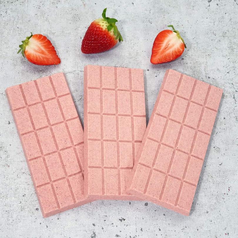 - Aus hochwertigen Zutaten wie Kakaobutter, Sahnepulver und gefriergetrocknetem Erdbeerpulver aus 100 % Erdbeeren