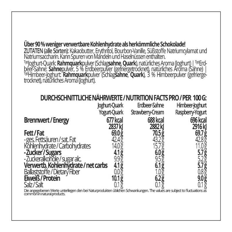 - Aus hochwertigen Zutaten wie Kakaobutter, Sahnepulver, Rahmquarkpulver und gefriergetrockneten Fruchtpulvern