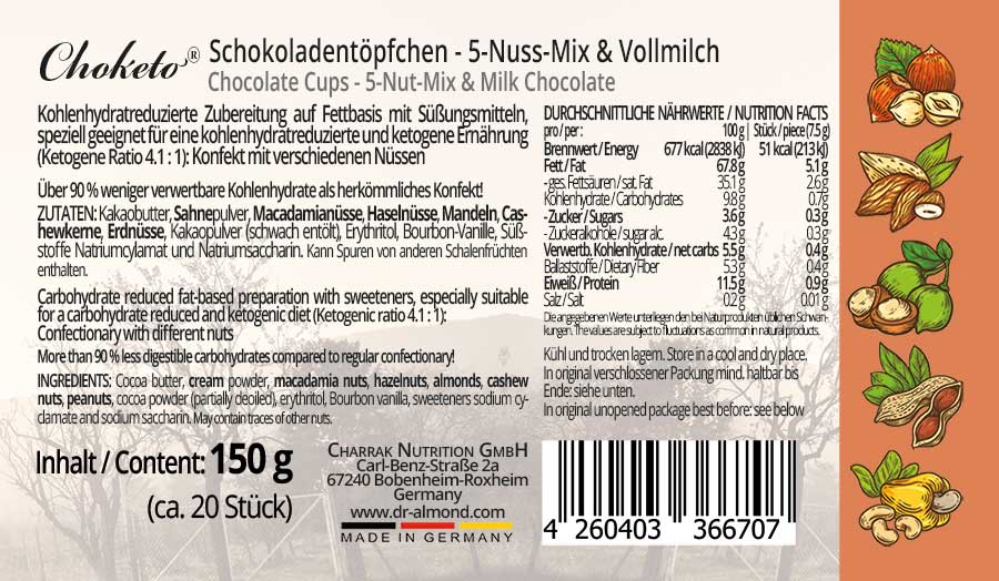 CHOKETO Schokoladentöpfchen 5-NUSS-MIX & Vollmilch – Low Carb & Keto Schokolade – handgemacht
