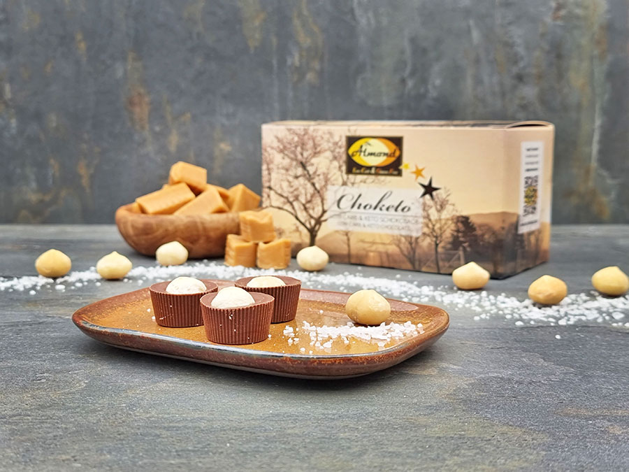 CHOKETO Schokoladentöpfchen SALZMACADAMIA & Karamellmilch – Salzkaramell Low Carb & Keto Schokolade – handgemacht