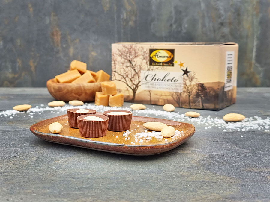 CHOKETO Schokoladentöpfchen SALZMANDEL & Karamellmilch – Salzkaramell Low Carb & Keto Schokolade – handgemacht