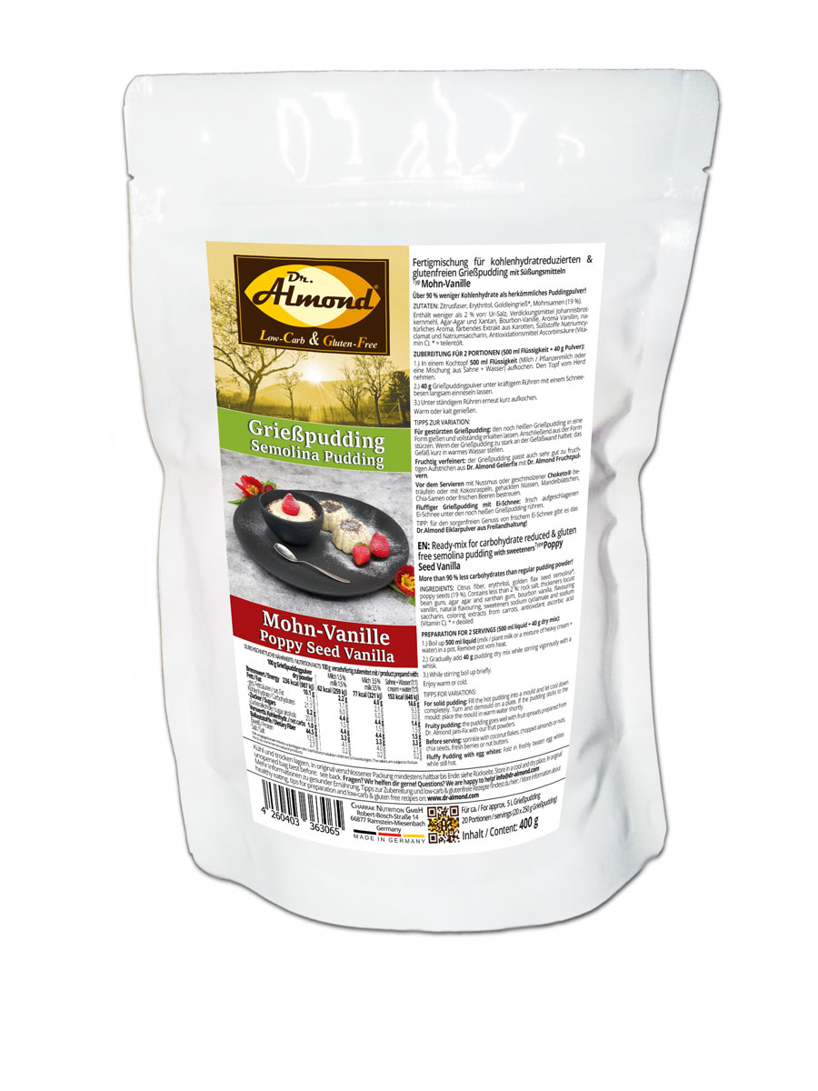 Artikelnummer: 306-03 Kategorien: Artikel mit verfügbaren Produktproben, Desserts, Frühstück, Fürs Frühstück, Pudding Schlagwörter: Griessbrei, Griesspudding, Pudding, PuddingpulverFertigmischung für kohlenhydratreduzierten & glutenfreien Grießpudding mit Süßungsmitteln Typ „Mohn-Vanille“