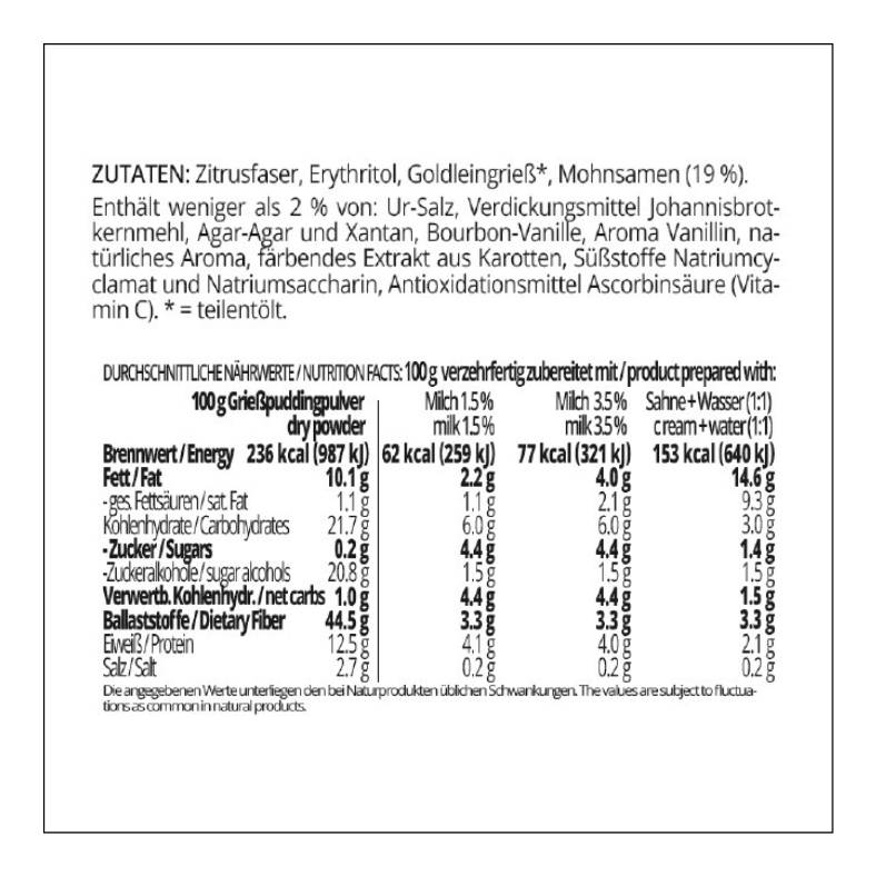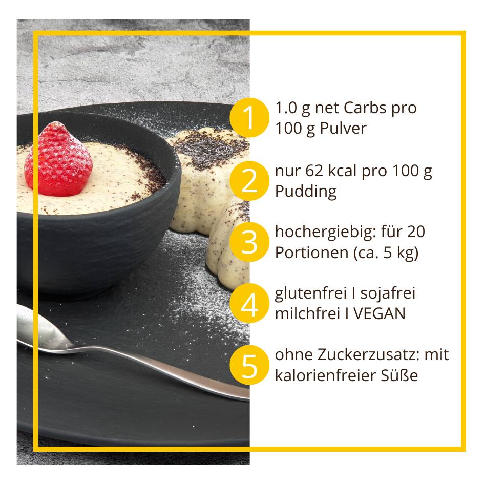 - Keto-tauglich: nur 1.5 g verwertbare Kohlenhydrate pro 100 g Pudding bei der Zubereitung mit Sahne