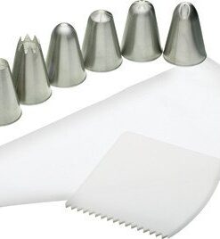 In diesem praktischen Set bekommst du einen wiederverwendbaren Spritzbeutel, 7 verschiedene Spritztüllen aus Edelstahl und einen Teigschaber. Im Spritzbeutel kannst du die gesamte Teigmenge aus einem Brandteig-Grundrezept unterbringen.