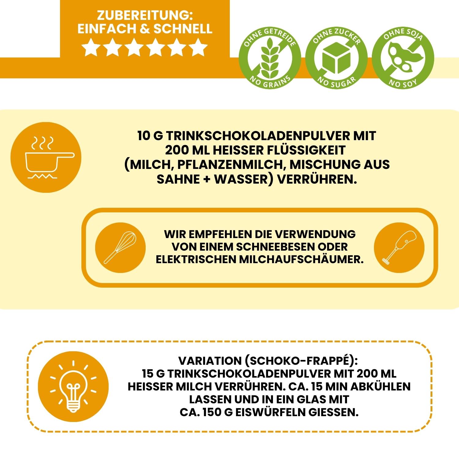 - Schnelle Zubereitung mit 200 ml heißer Flüssigkeit nach Wahl (Milch, Pflanzendrink, Wasser-Sahne-Gemisch)