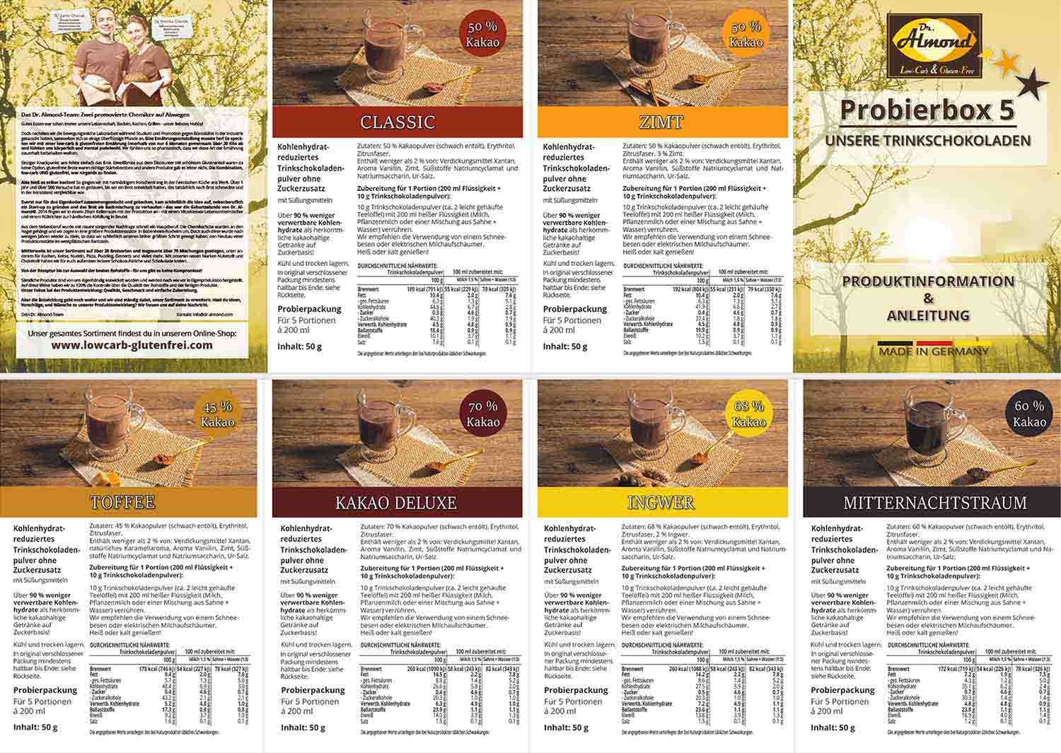 Artikelnummer: 905-99 Kategorien: Kakaoprodukte & Sahnepulver, Probier-Sets, Schokolade, Trinkschokolade Schlagwörter: Kakao, Proben, Probepackung, Probierpaket, Schokolade, Testpaket, TrinkschokoladeFertigmischung für kohlenhydratreduzierte und glutenfreie Trinkschokolade – Probierbox 5: Mit 6 Probierpäckchen Dr. Almond Trinkschokolade zum Testen