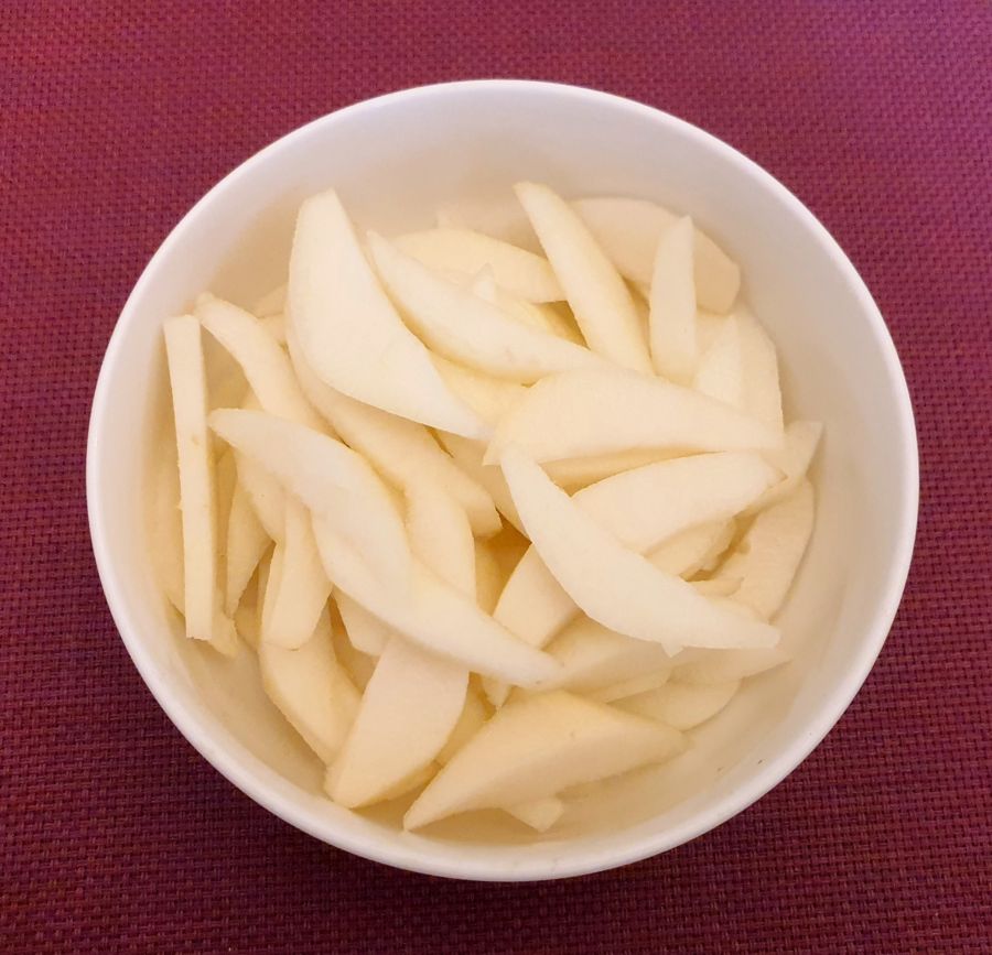 - In der Zwischenzeit die Birnen schälen und in dünne Spalten schneiden.