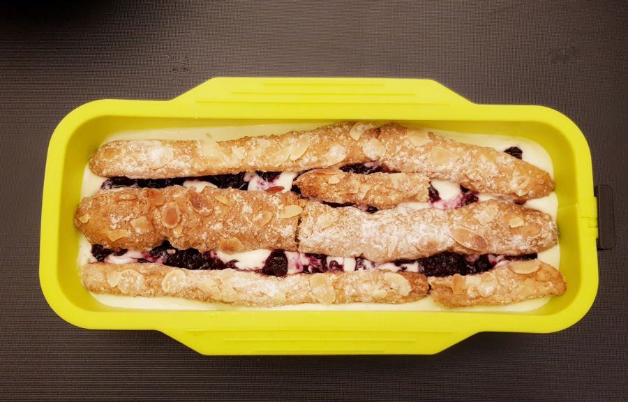 - Die Heidelbeeren mit einem kleinen Löffel in die Creme ziehen. Dann Brandteigstangen in die Creme schichten und wieder mit Creme auffüllen. Die Backform erneut auf der Tischkante etwas aufklopfen. Dann ca. 15 Minuten warten, die Creme sinkt etwas ab. Nach der Wartezeit wieder Creme einfüllen und die restlichen Brandteigstangen aufsetzen. Die restliche Creme fürs Verzieren in den Kühlschrank stellen. Die Backform über Nacht in den Kühlschrank stellen.