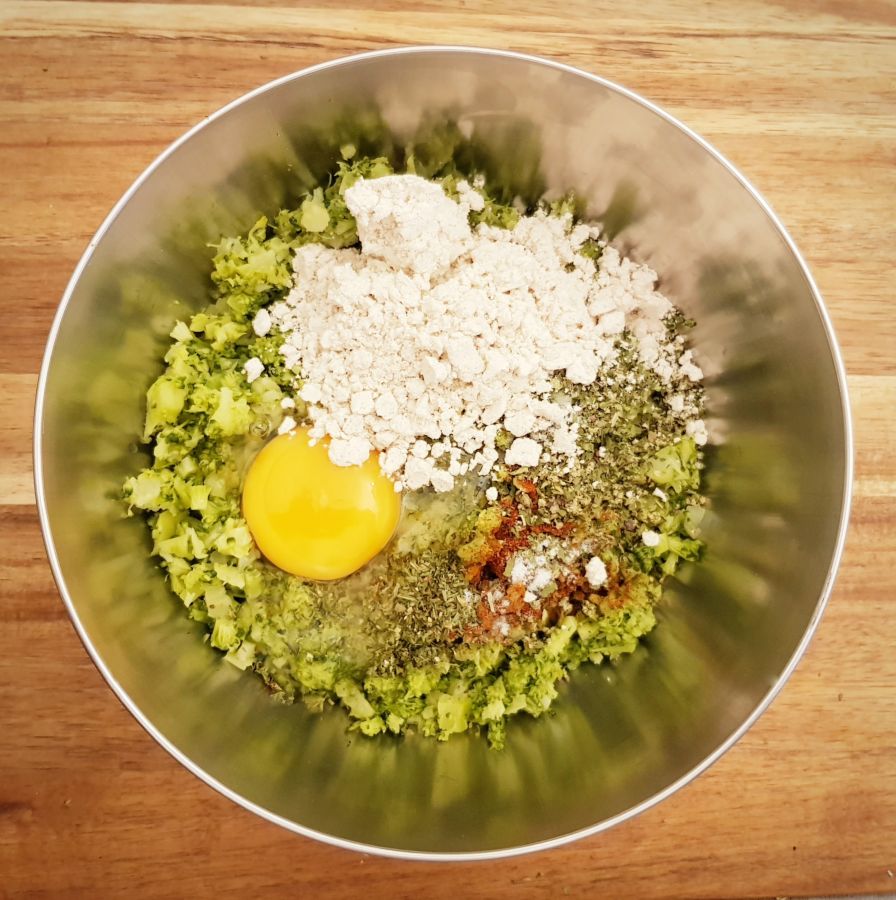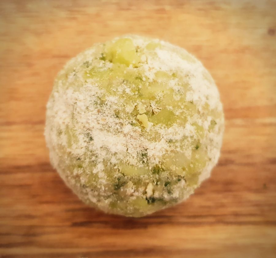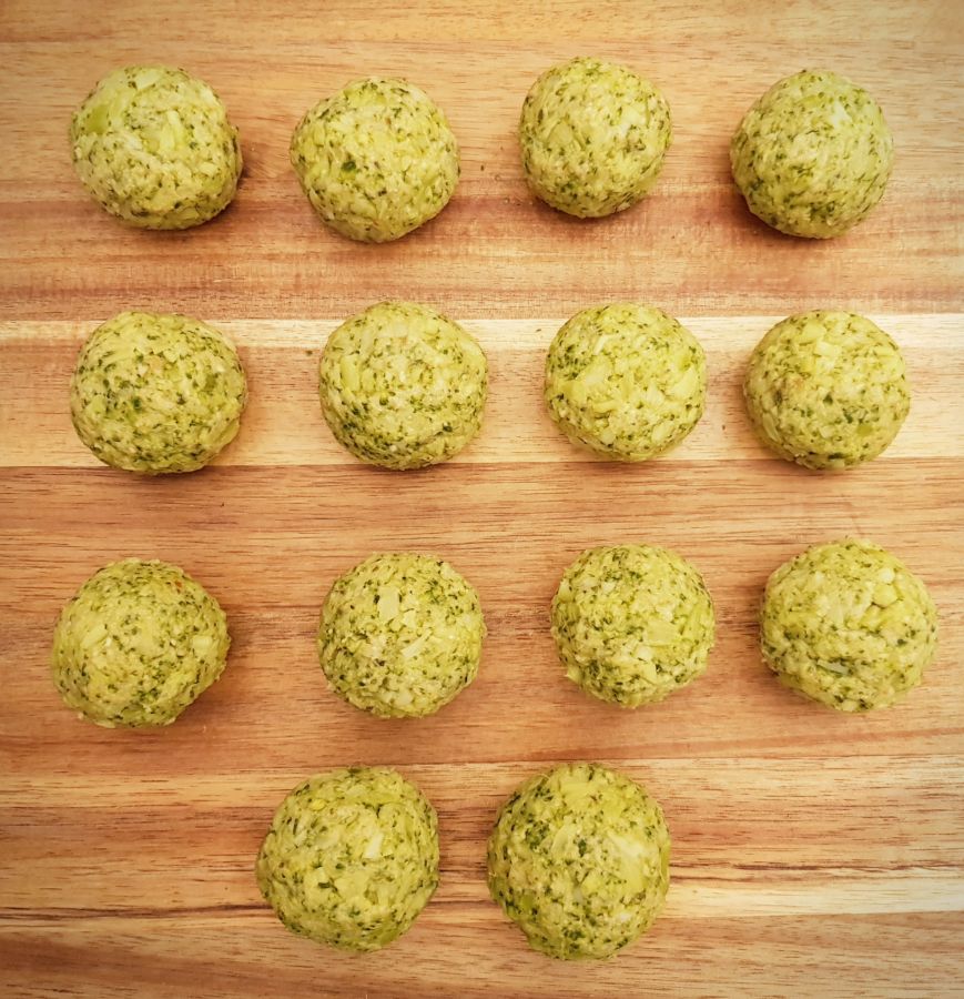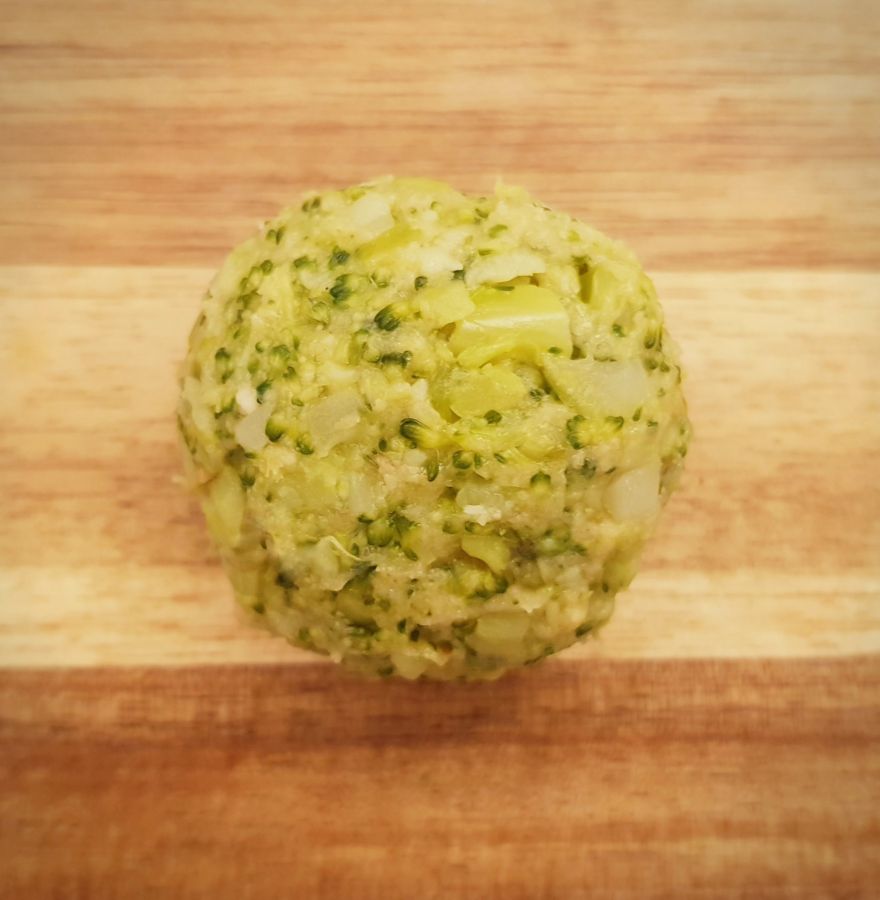 - Je ca. 40g Broccolimasse in der Handfläche flachdrücken und mittig ein Mozarellabällchen setzen. Komplett verschließen und in der Toastbrotmischung wälzen. Wiederholen bis die Masse verbraucht ist.