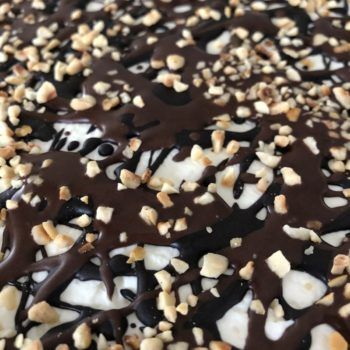 - Zur Deko geschmolzenen Schokoladenzauber und gehackte Nüsse drauf verteilen. Ich habe hier die beiden Sorten Schokoladenzauber "Vollmilch" und "Schwarze Sahne" gemischt - sieht einfach super hübsch aus und schmeckt super lecker!