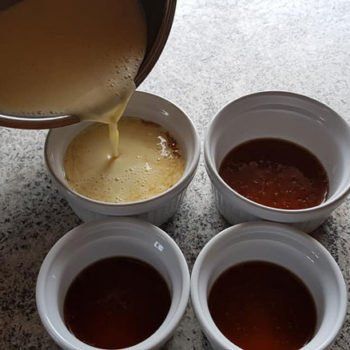 - Die Crème-Mischung durch ein Sieb seihen (um den noch evtl. vorhandenen Schaum zu entfernen) und anschließend langsam in die Schälchen füllen. Diese dann in die Fettpfanne stellen, und bei 150 °C bei Ober- und Unterhitze für ca. 40-45 min stocken lassen.