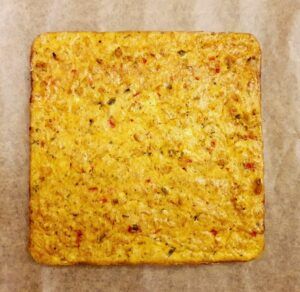 - Auf den vorgebackenen Boden 15g Cheddar gerieben verteilen, und dann gleichmäßig die Hähnchenmasse verteilen.