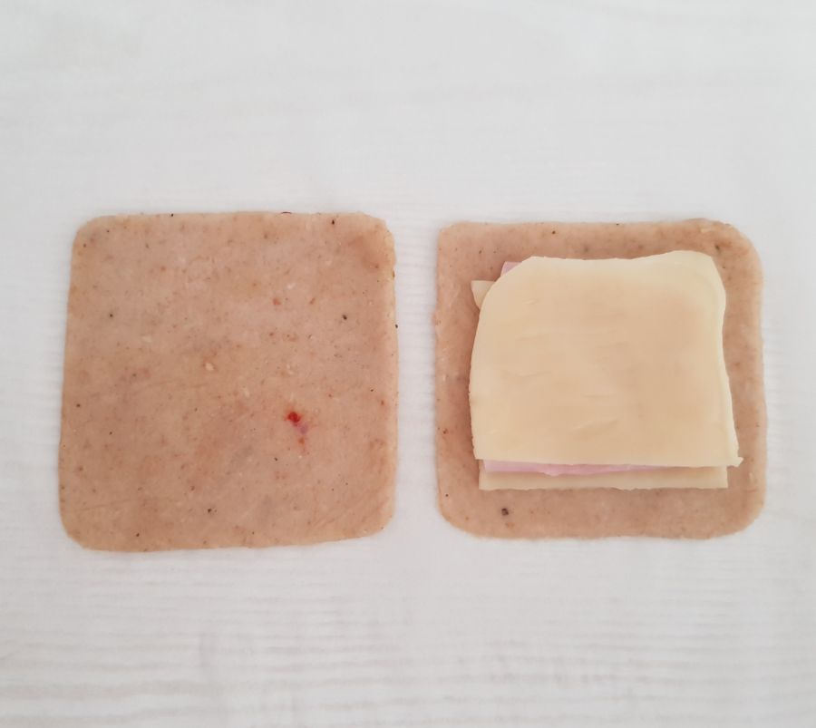 - Dann Schinken und Käse passend zurechtschneiden. Sollten etwa die Größe 8 x 8 cm haben. Muss ja nicht ganz gleichmäßig sein ?