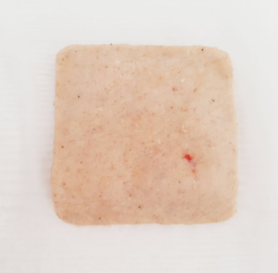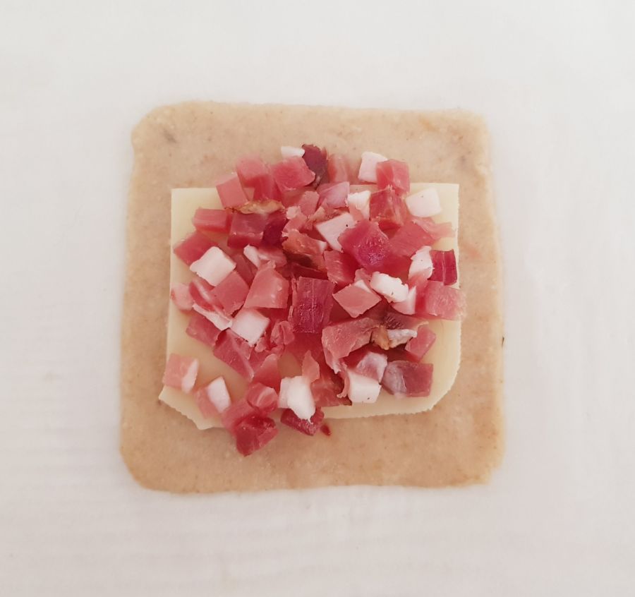 - In der Mitte der ausgestochenen Quadrate Käse und Schinken auflegen, wobei der Schinken in der Mitte sein soll. Es muss unbedingt ein Teigrand bleiben, den mit Wasser bestreichen und zum Abschluss ein Teigquadrat auflegen. Mit feuchten Fingern den Rand zusammendrücken und glätten (siehe Foto). Der Rand muss sehr gut zusammengedrückt sein, sonst läuft der Käse aus. Ich hab einen Teil mit Speckwürfel gefüllt.