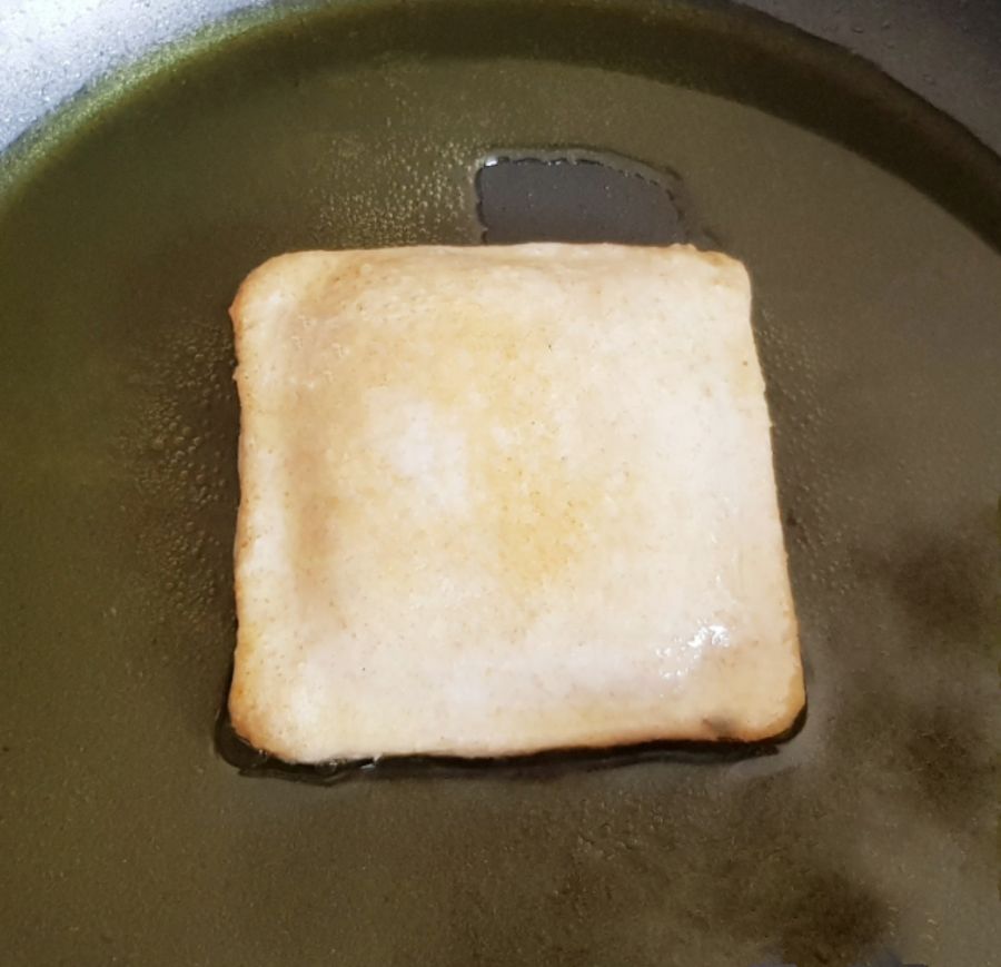 - Wenn alle Quadrate gefüllt und gut verschlossen sind, die Toasties vorbacken. Dafür Ghee in der Pfanne bei mittlerer Hitze schmelzen lassen und die Toasties von jeder Seite 10 Minuten vorbacken. Nach dem Backen auf eine Küchenrolle zum Abtropfen legen.