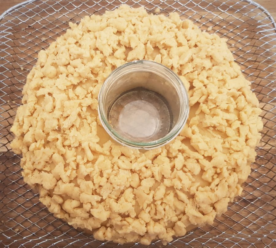 - Mit einem verquirltem Ei bestreichen und 2/3 des Streuselteiges Streusel auf dem Kranz verteilen. Den Rest vom Ei und den Streuselteig zur Seite stellen.