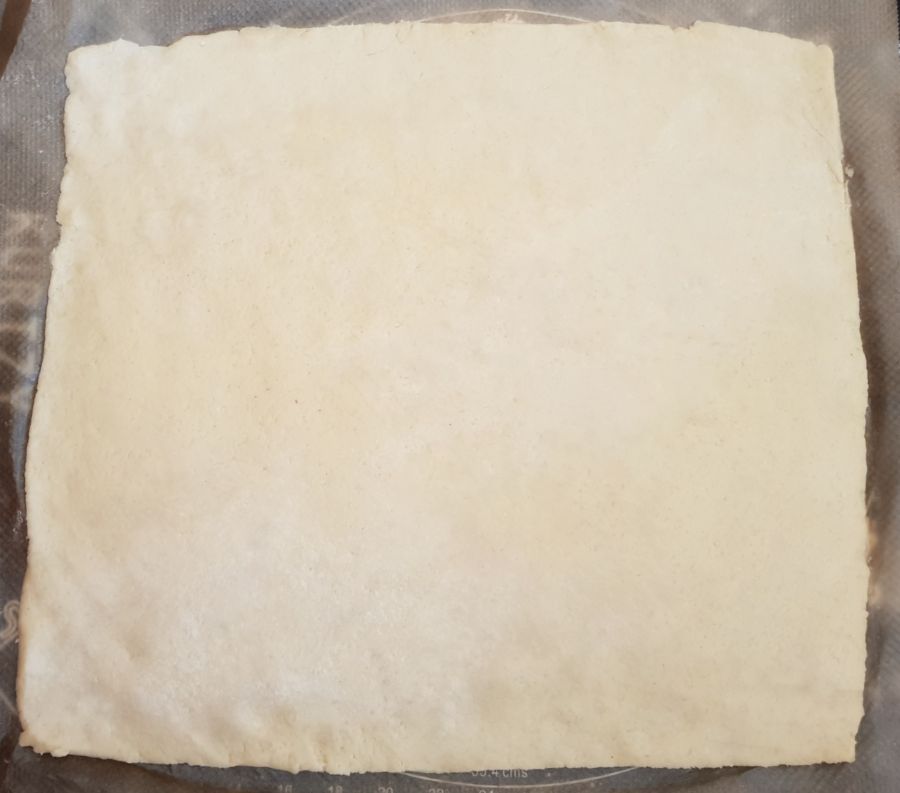 - Nach dem Ausrollen die Ränder links, rechts und unten mit Wasser benetzen und etwas einklappen