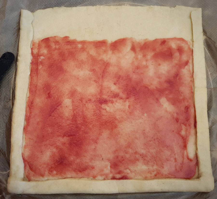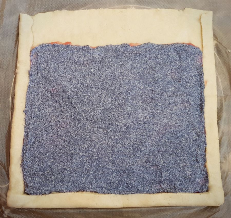 - Mit Himbeermarmelade bestreichen - 1/5 des Teiges oben nicht bestreichen! Danach mit der Mohnmasse bestreichen.
