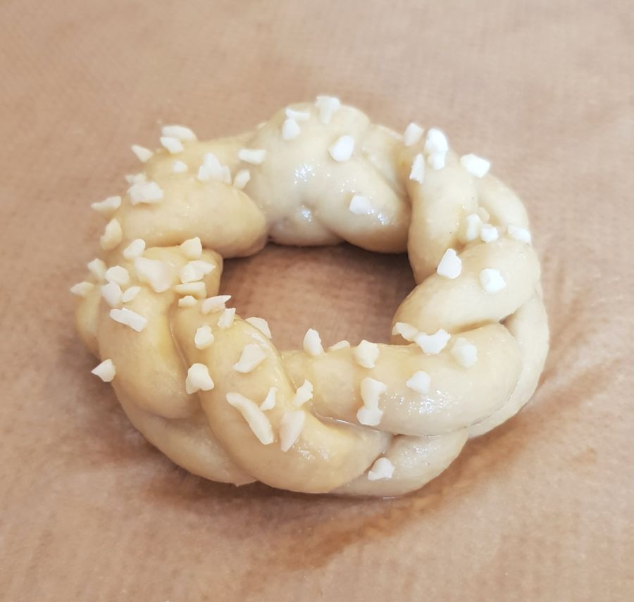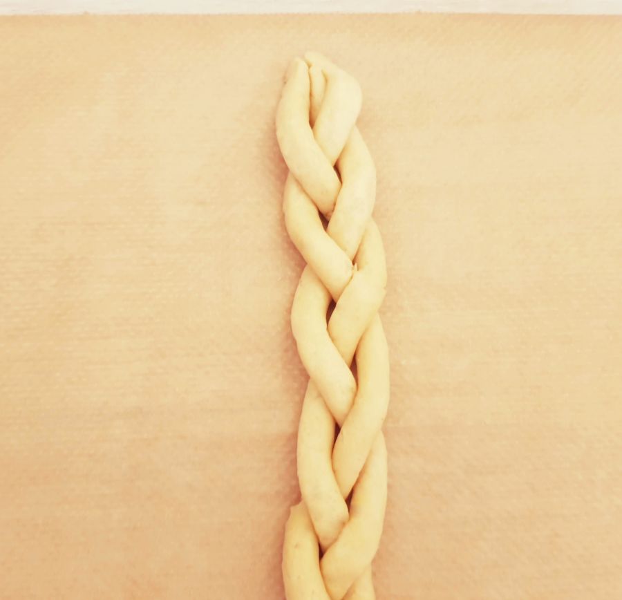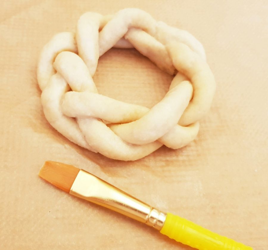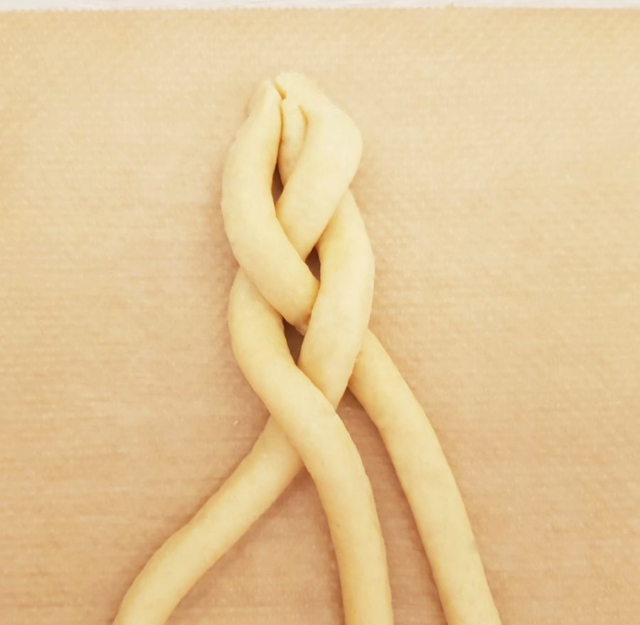 • Tipp: Wenn der Teig beim Flechten etwas ausfranzt, einfach mit einem kleinen Pinsel und Wasser ausbessern. So kann man die Teiglinge schön glatt bekommen. Man kann so auch kleine Macken ausbessern.