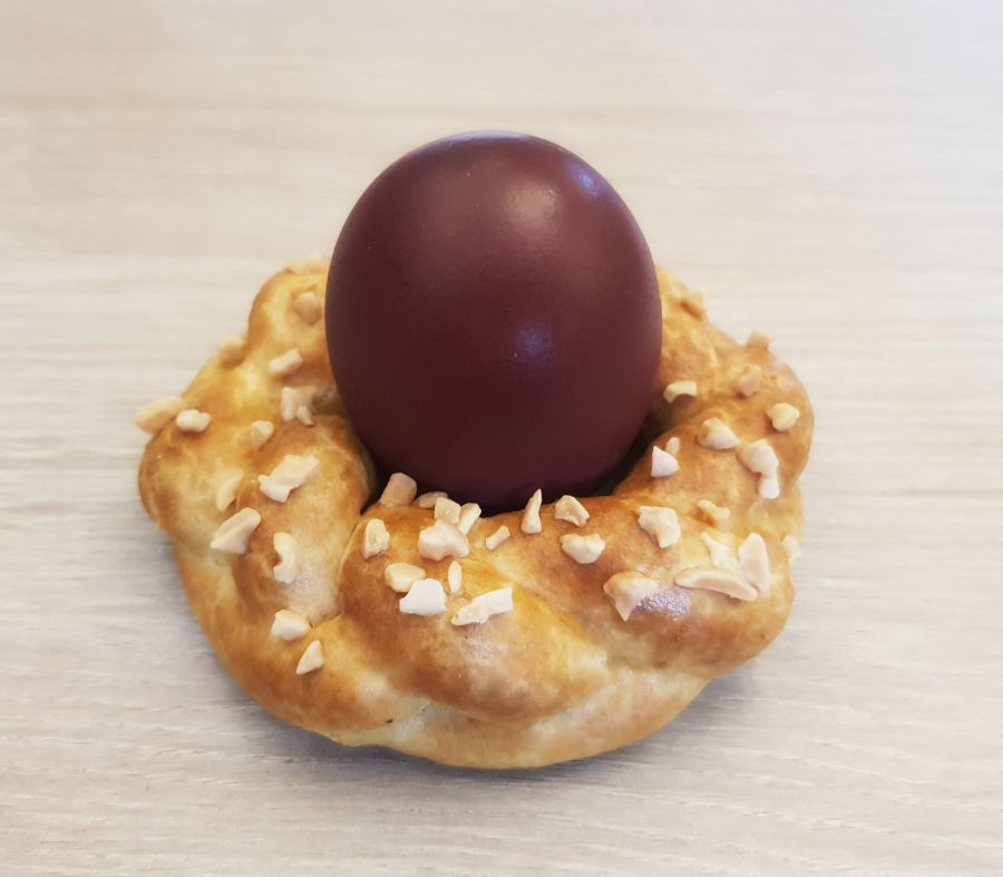 • Teig in je 25g teilen und mit Hilfe von Bambusfaser 3 Stränge mit der Hand drehen. Danach zu einem Zopf flechten. Den Zopf zu einem Kranz/Nesterl zusammen setzen, so dass ein Ei reinpasst.