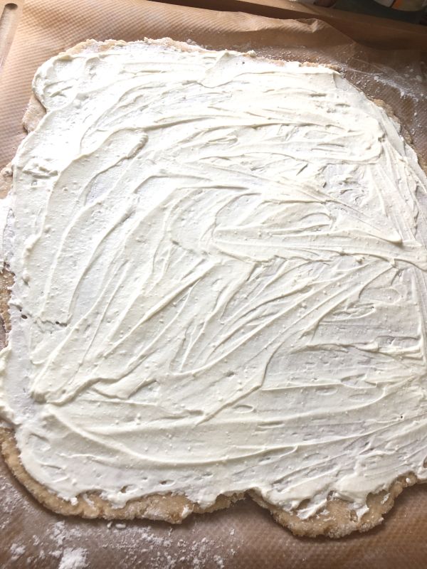 - Mit feuchten Händen den Teig zu einer Kugel formen und auf das Backpapier geben. Mir Bambusfaser bemehlen und etwas flach drücken. Mit der Teigrolle rechteckig ausrollen. Siehe Bilder unten!