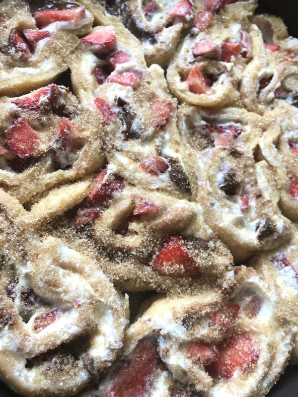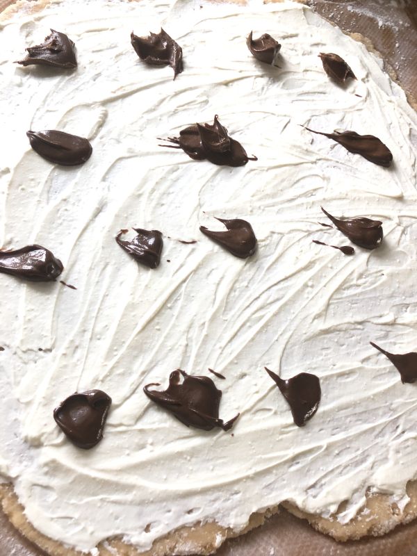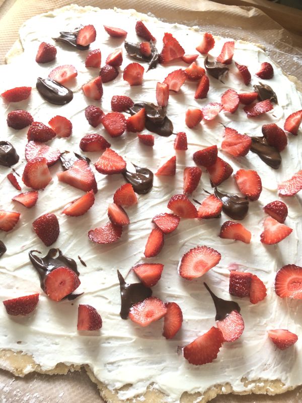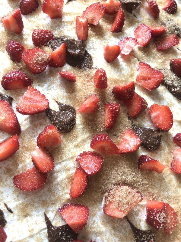 - Den Ricotta auf dem Teig verstreichen. Nuketo drauf geben (siehe Bilder). Zerkleinerte Erdbeeren verteilen und mit Karamelltraum bestreuen.