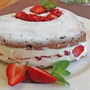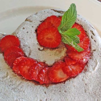 - Die Torte nun vorsichtig auf eine Platte stürzen. Mit Vanilletraum oder Pudererythrit bestäuben und die Erdbeeren in Scheibchen schneiden und in die EInbuchtungen oben füllen. Den Rand der Torte glatt streichen. Nach Belieben dekorieren.