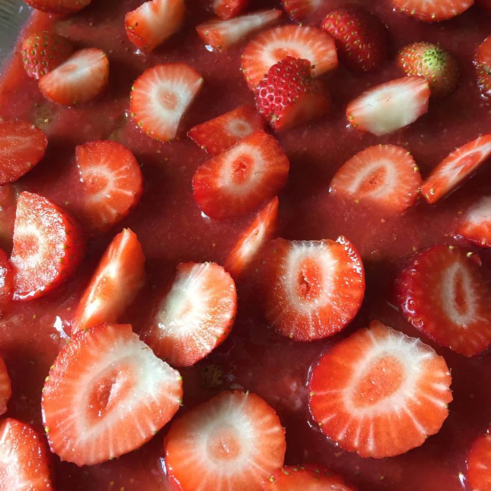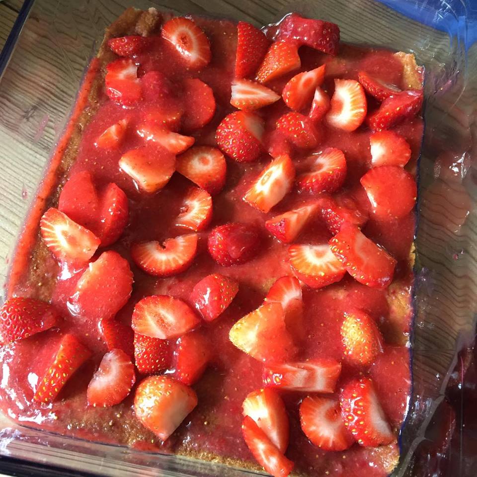 - Nun den Boden mit Biskuit belegen und mit der pürierten Erdbeermasse tränken. Darauf geschnittene Erdbeeren und Creme geben, dann wieder Biskuit und tränken usw. – als obere Schicht sollte sich Creme befinden. Oben drüber zum Schluss Backkakao sieben.