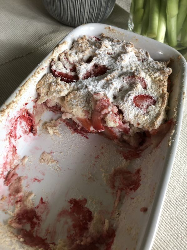 - Nun den Kuchenzauber vorsichtig in 2-3 Portionen mit einem Spatel unter die Baisermasse heben. Die klein geschnittenen Erdbeeren unterheben!