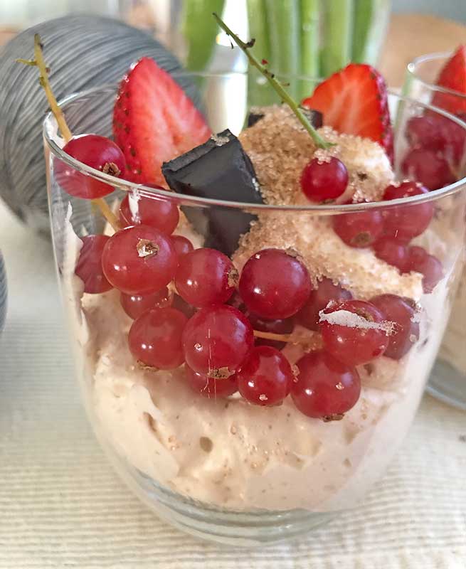 - Den Fluff in 3 Gläser abfüllen und nach Belieben mit Früchten, Karamelltraum und Schokolade dekorieren! Beeren passen herrlich dazu! Diesen Fluff möglichst am gleichen Tag vom Verzehr zubereiten. Nach einer Stunde im Kühlschrank bekommt er eine Konsistenz wie MOUSSE! Super lecker! Man kann oben drauf auch etwas LowCarb-Eierlikör und Nüsse geben als Deko! Lasst Euch was einfallen!