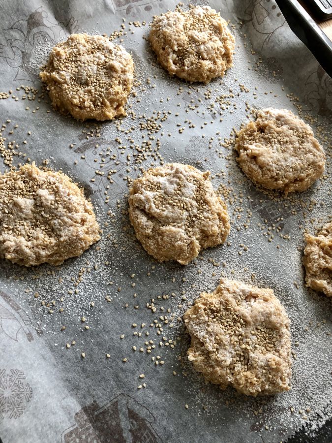 - Mit einem Löffel 6-7 Teighäufchen auf Backpapier setzen, etwas platt drücken (nur wenig siehe Fotos) - mit Bambusfaser bestäuben, Sesam draufgeben und bei 190 Grad Umluft ca. 60 Minuten backen! Auf Gitter auskühlen lassen.