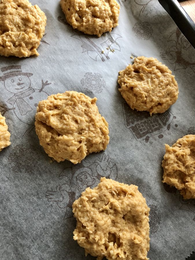 - Mit einem Löffel 6-7 Teighäufchen auf Backpapier setzen, etwas platt drücken (nur wenig siehe Fotos) - mit Bambusfaser bestäuben, Sesam draufgeben und bei 190 Grad Umluft ca. 60 Minuten backen! Auf Gitter auskühlen lassen.