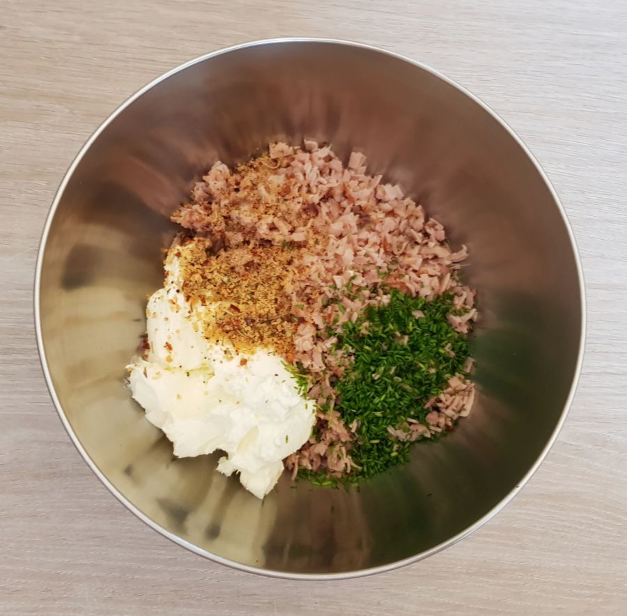 - Den Magerschinken klein schneiden und in Ghee anbraten, mit Frischkäse, Knoblauch, Schnittlauch und den Gewürzen vermengen. Mit dem Stabmixer kurz pürieren. (So geht die Masse leichter zum verarbeiten). Abschmecken und evtl. nachwürzen.