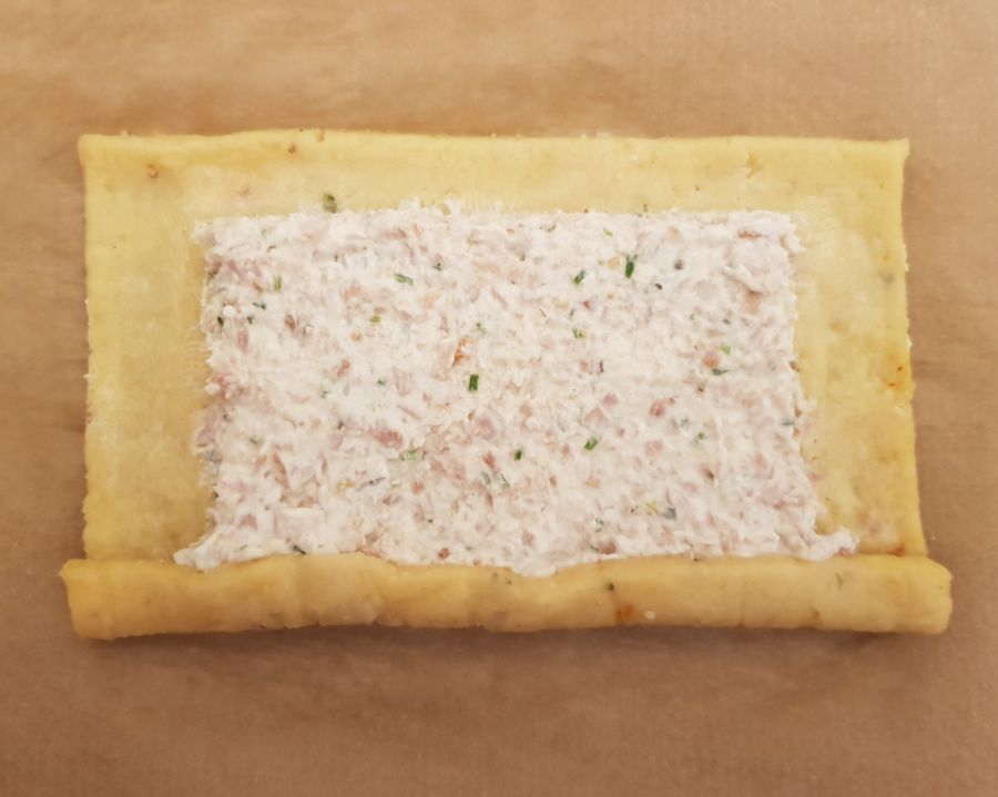 - Rechtecke in der Größe 9 x 13 cm mit einem Teigroller schneiden. Mit Frischkäsecreme bestreichen, dabei links, rechts und am oberen Rand einen Freiraum lassen. Nicht ganz einstreichen. Dann vom unteren Rand, der voll bestrichen ist, zum eng einrollen beginnen und zum Ende hin lockerer werden.