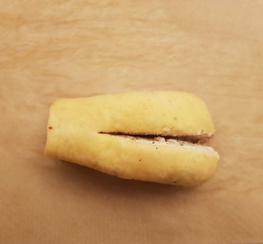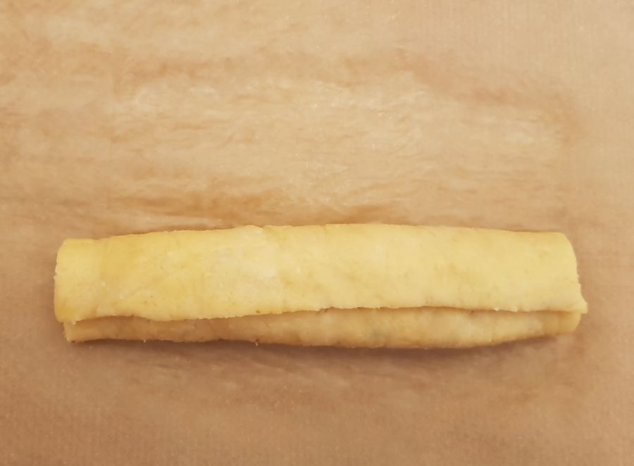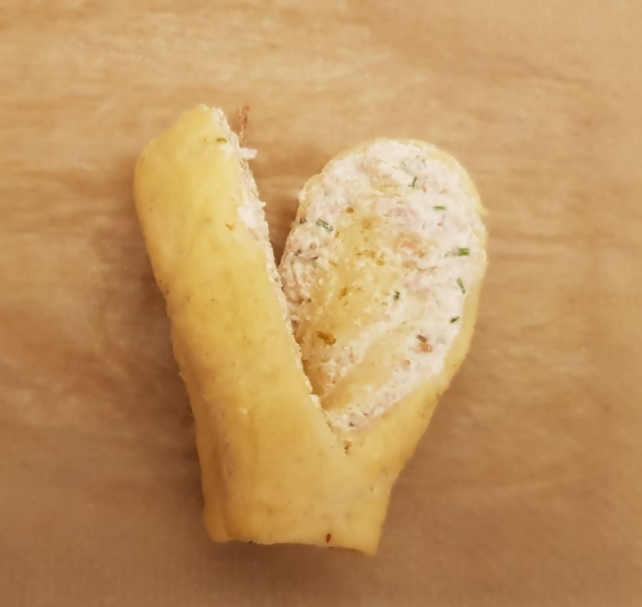 - Die Rolle dann von rechts nach links überklappen. Danach mit einem Messer mittig 2/3 einschneiden. (Siehe Foto) Den Teigling drehen und den rechten Einschnitt nach außen drehen, danach den linken und den unteren Teil mit feuchten Fingern zum Herzspitz formen.