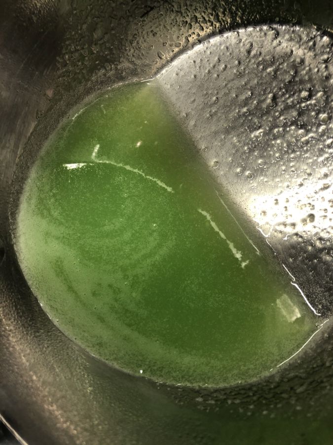 - Alles zusammen erwärmen, kurz aufkochen, vom Feuer nehmen und gut durchrühren, bis sich alles gelöst hat. Nach Belieben ein paar Tropfen Lebensmittelfarbe unterrühren.