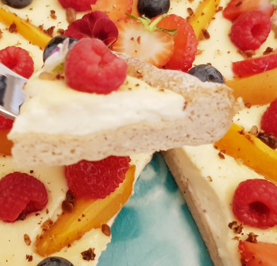 Früchtepizza mit der extra Portion Protein und Kollagen! Eignet sich als süße Hauptspeise oder in Stücken als Dessert für 4 Personen! Pro Stück nur 6g Kohlenhydrate und 17g Protein!