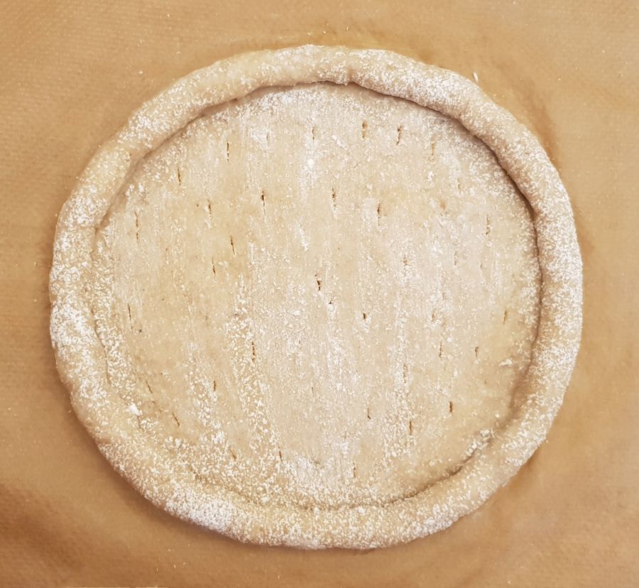 - Teig mit Bambusfaser rund ausrollen, den Rand einrollen und hochziehen. Mit feuchten Fingern den Rand glätten, den Boden einstechen.