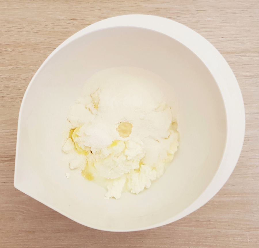 - Milch leicht erwärmen, Zucker und Hefe hinzufügen, gut umrühren und abdecken.