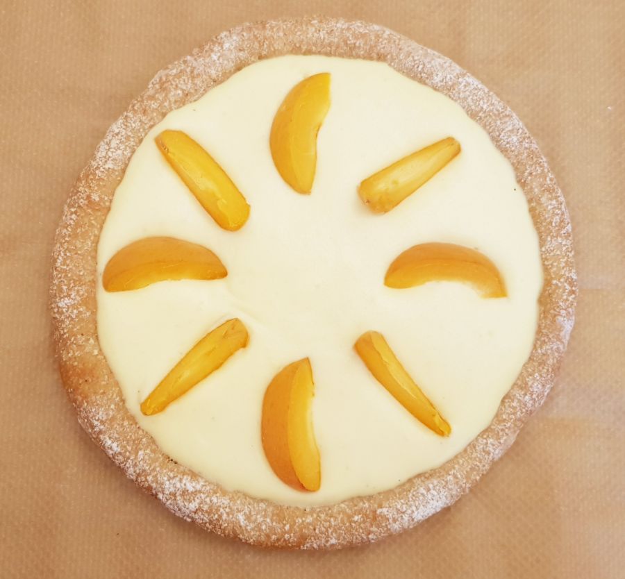 - Die Aprikose/Marillen in Spalten schneiden und in die Kollagencreme legen. Bei 130 Grad weitere 25 Minuten backen.