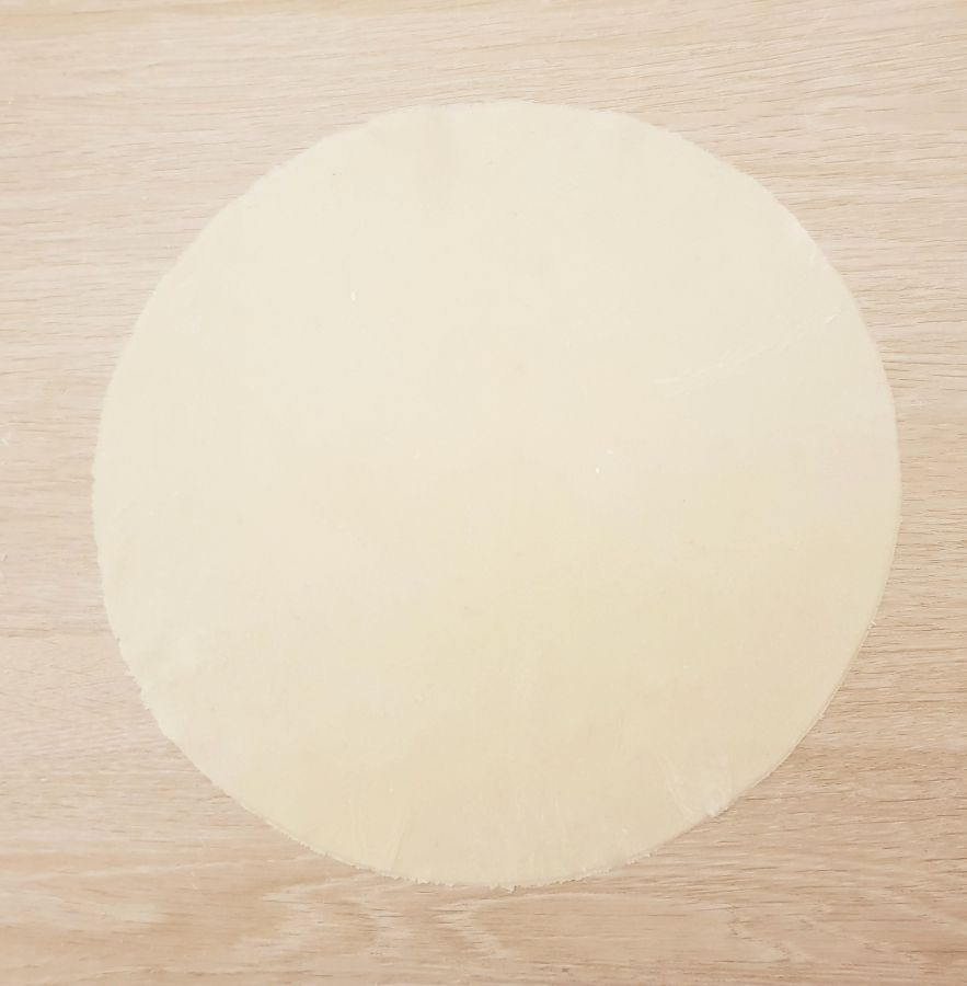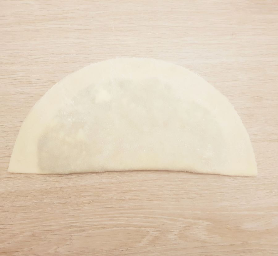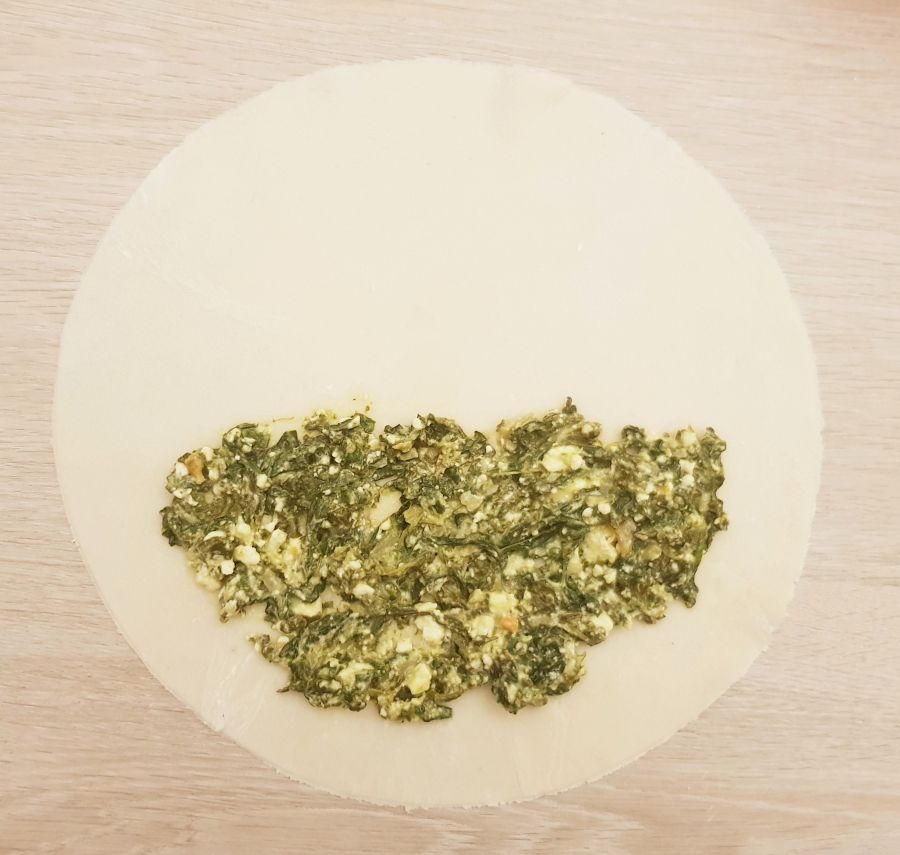 • Aus dem Pastazauber, der Low Carb Süße, Salz und Wasser einen Teig zubereiten. In 7 Teile aufteilen und mit Hilfe von Bambusfaser runde Kreise ausrollen. Durchmesser ca. 24cm, ergibt 7 runde Teilchen. Auf die Hälfte des Runden Teilchen die Spinatmischung gleichmäßig verteilen. Rand etwas aussparen. Bevor man die Hälften zusammenfaltet, den Rand mit Wasser benetzen und dann umfalten. Den Rand etwas andrücken. Bei den restlichen Teilchen genauso vorgehen.