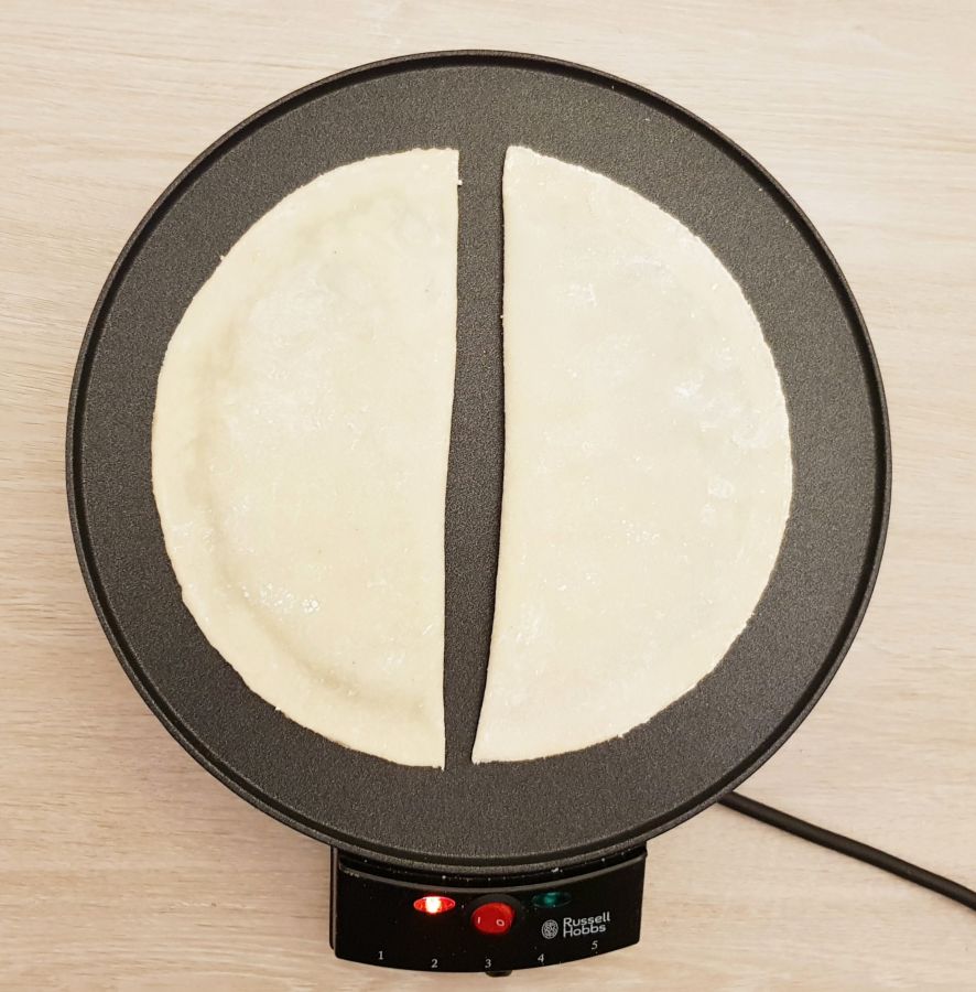 • Auf einem Crepemaker oder in einer beschichteten Pfanne ohne Zusatz von Fett von jeder Seite ausbacken.