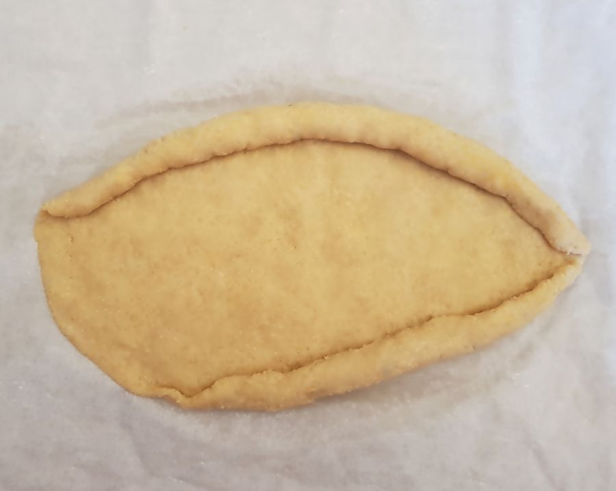 - Kugeln formen und mit den Fingern die Teigkugel oval glatt drücken. Vom oben bis zu den Seiten beginnend einrollen (siehe Foto). Von unten auch, seitlich mit den Fingern zusammendrücken. Mit Wasser und Pinsel den Teig glätten, den Boden einstechen und Backperlen(Backerbsen) in die Mulde füllen. So bleibt die Mulde auch schön flach. Beide Teiglinge auf ein Backpapier setzen und bei 175 Grad 20 Minuten vorbacken.