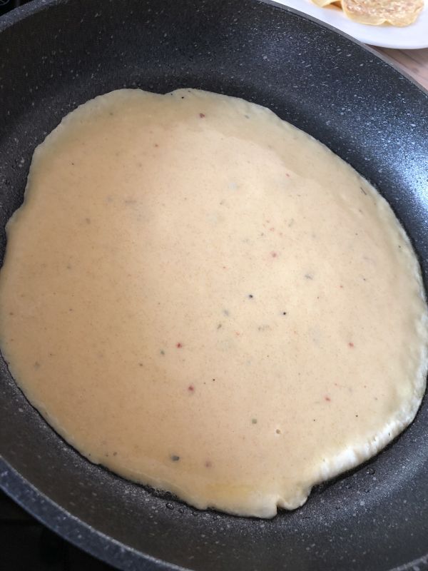 - Backmischung mit Milch und Gewürz mischen, die Eier zugeben und alles gründlich zu einem glatten Teig verrühren. In einer leicht gefetteten Pfanne 4 Stück Pfannkuchen bei mittlerer Hitze von beiden Seiten goldbraun backen.